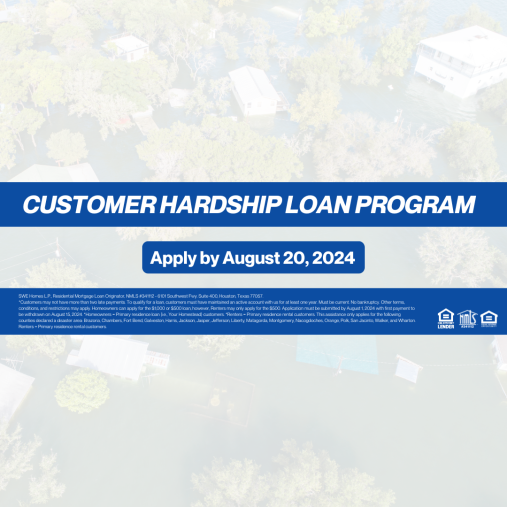*Customers may not have more than two late payments. To qualify for a loan, customers must have maintained an active account with us for at least one year. Must be current. No bankruptcy. Other terms, conditions, and restrictions may apply. Homeowners can apply for the $1,000 or $500 loan, however, Renters may only apply for the $500. Application must be submitted by August 20, 2024 with first payment to be withdrawn on September 1, 2024. *Homeowners = Primary residence loan (i.e., Your Homestead) customers. *Renters = Primary residence rental customers. This assistance only applies for the following counties declared a disaster area: Brazoria, Chambers, Fort Bend, Galveston, Harris, Jackson, Jasper, Jefferson, Liberty, Matagorda, Montgomery, Nacogdoches, Orange, Polk, San Jacinto, Walker, and Wharton.*