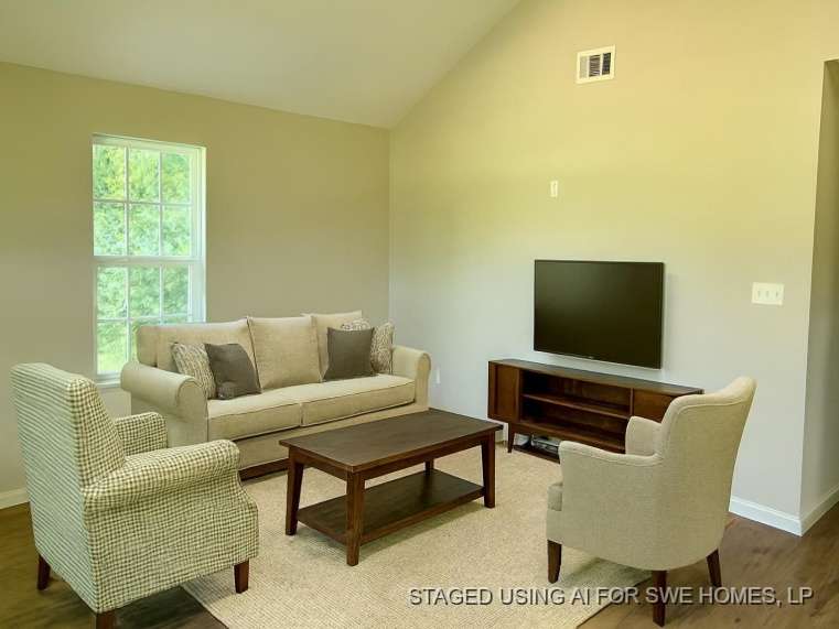The open-concept living area is filled with natural light and showcases elevated ceilings and durable vinyl flooring throughout the main living spaces, creating a bright and welcoming atmosphere perfect for relaxing or entertaining. The modern kitchen is tastefully updated with pale gray wood cabinetry and sleek, marble-inspired countertops that add a refined touch.