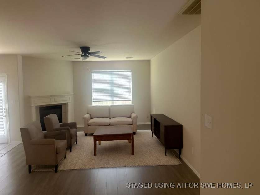 The home features a formal living area and a spacious family room with a cozy fireplace, creating the perfect setting for relaxing or entertaining. The kitchen opens to the living area and includes a breakfast bar and ample cabinet space, ideal for everyday living and gatherings.